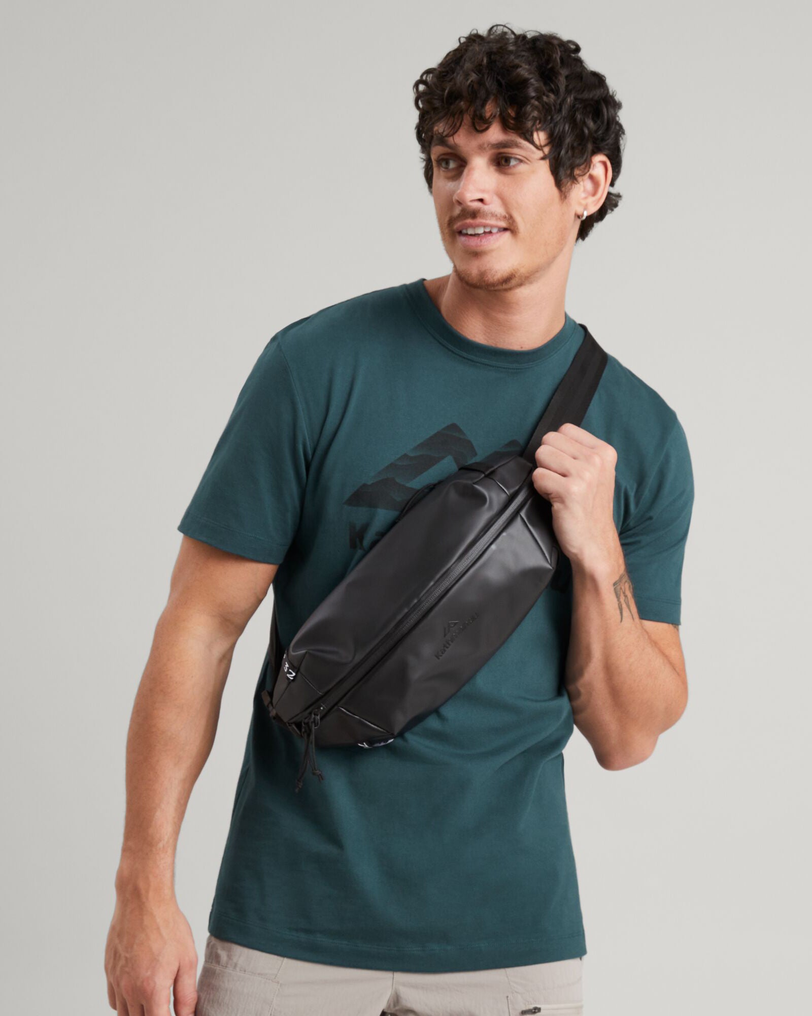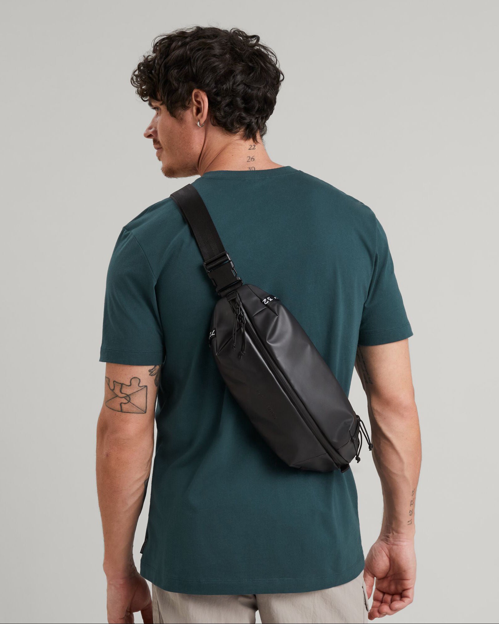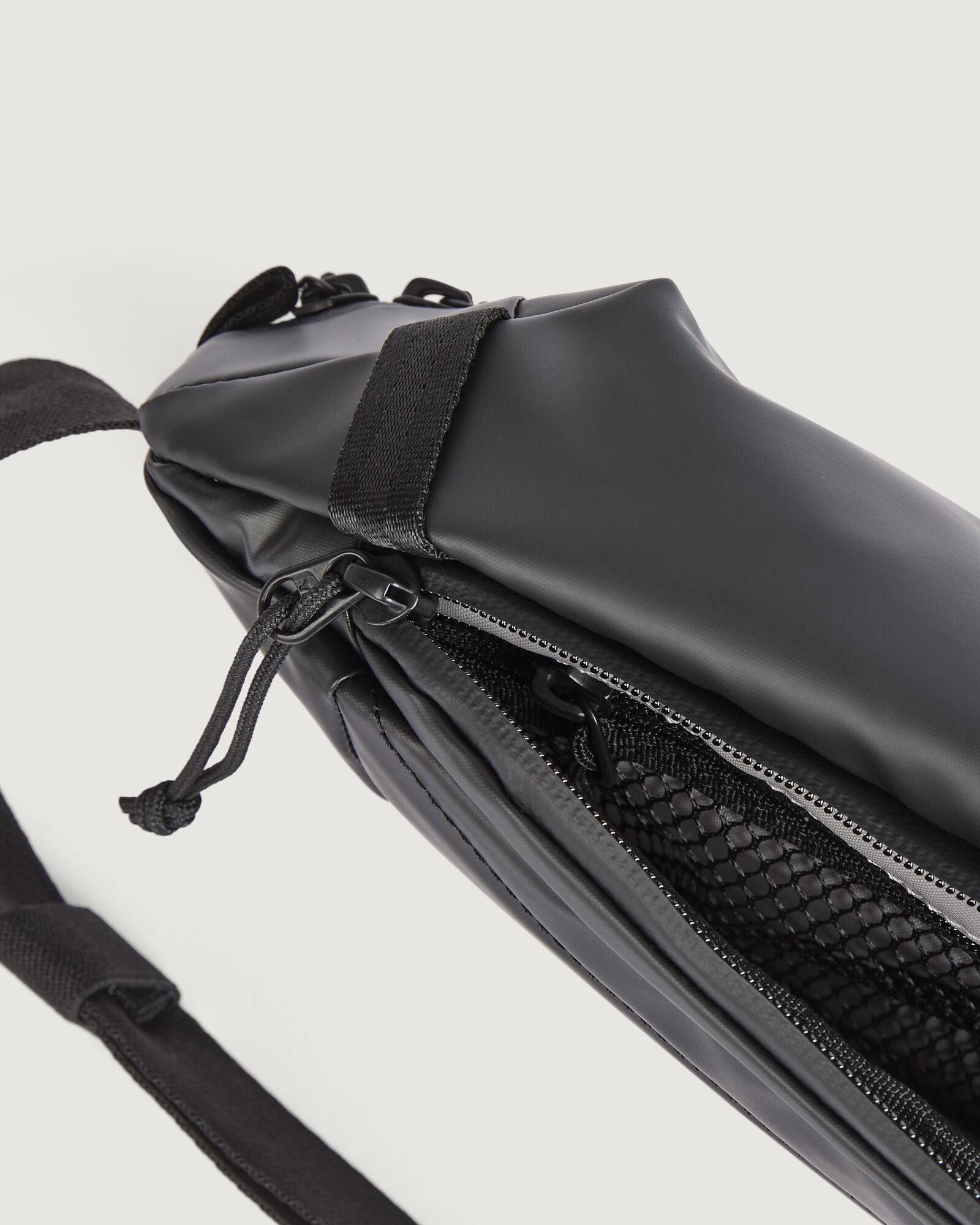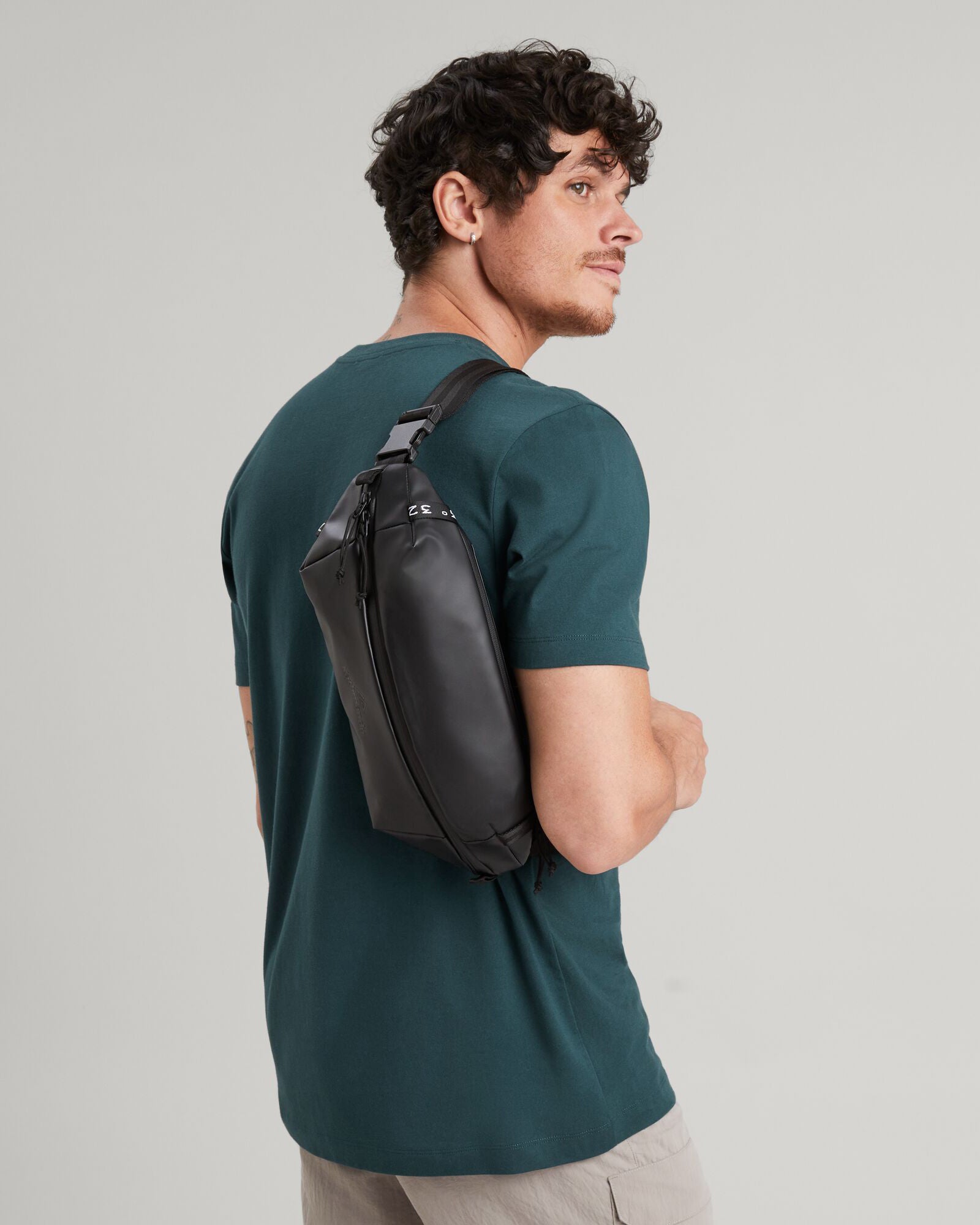Versatile, water resistant, close-to-body bag featuring a 100% recycled main fabric.