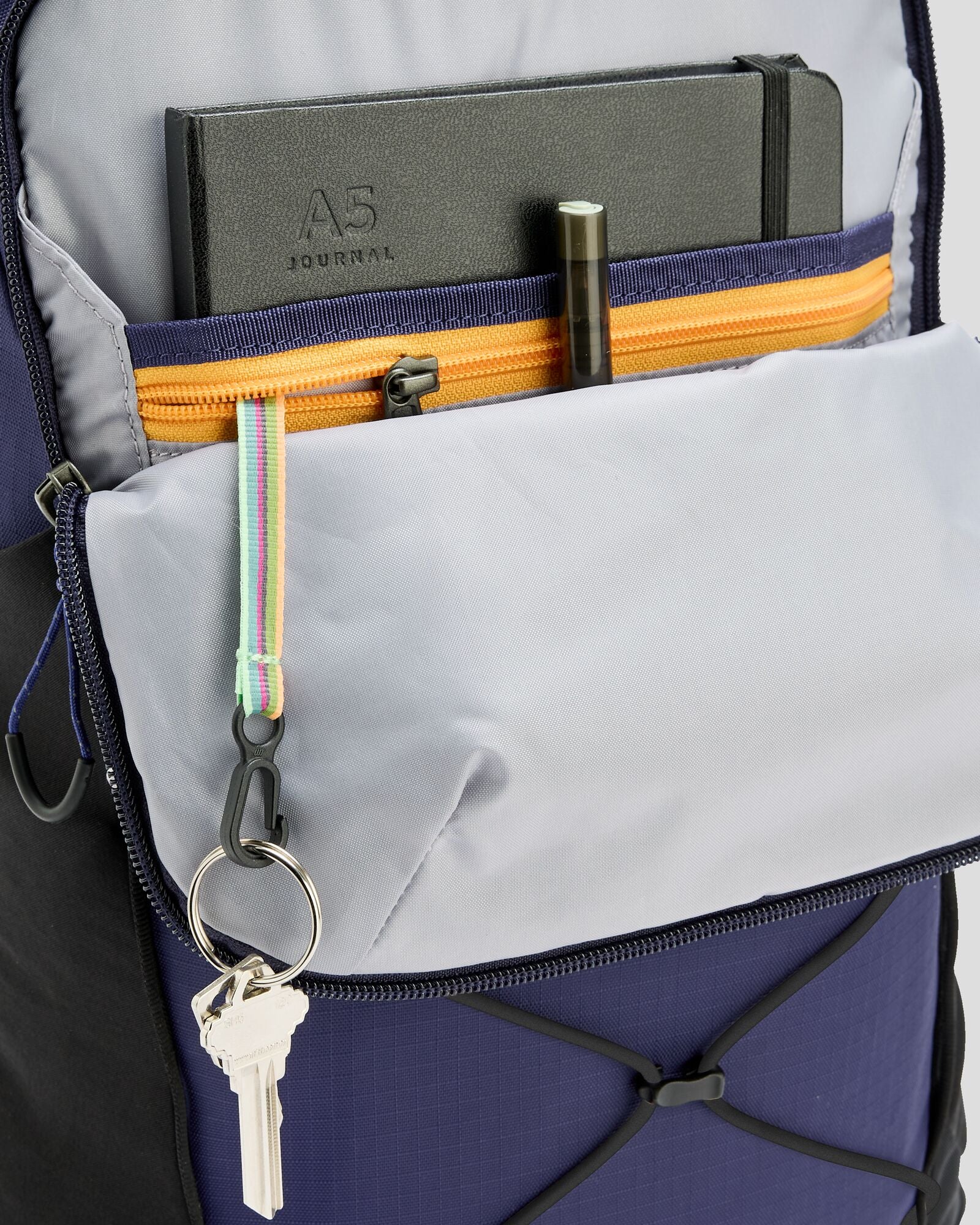 - Front zip compartment with zip mesh pocket and key clip.